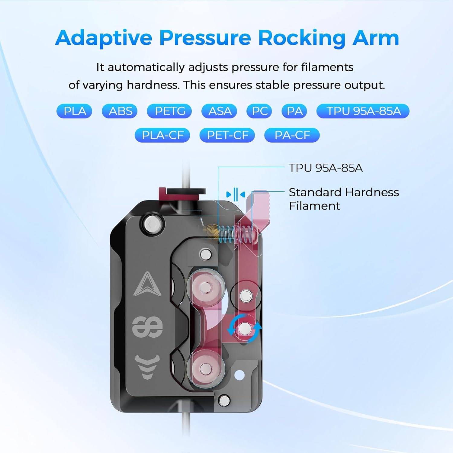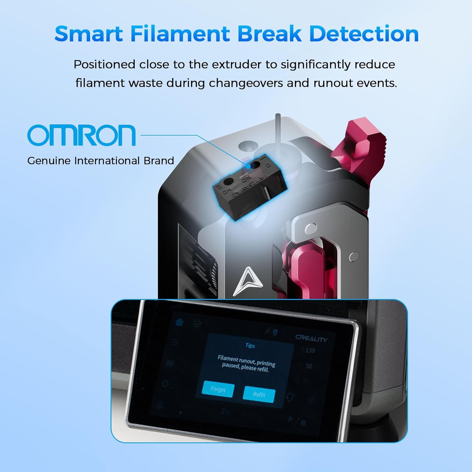 - Smart Filament Break Detection: The extruder is equipped with an intelligent material break detection system that monitors the feed status of consumables in real time, effectively detecting failed material feeding before printing and abnormal material breaks during printing. This upgraded extruder supports all types of printing consumables