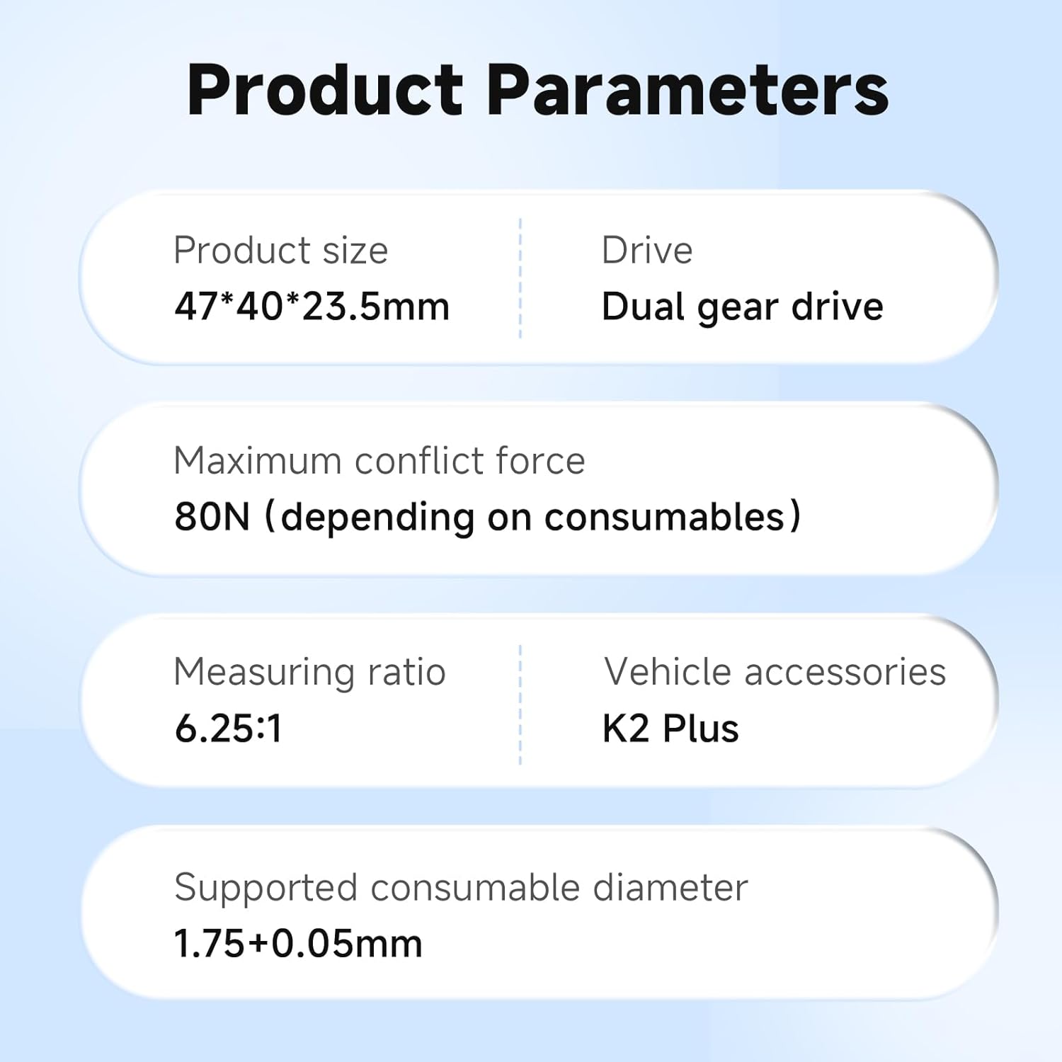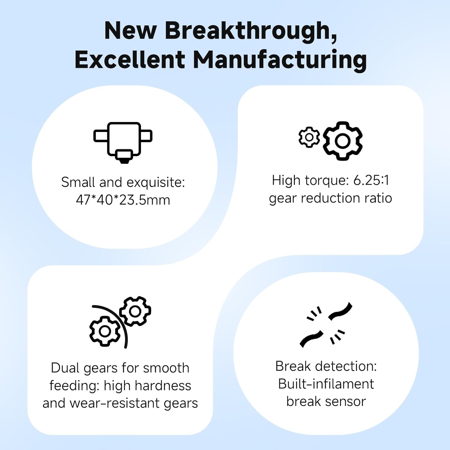 - 【Dual Gear Drive, Built to Last】:High-strength dual gears bite down on filament with perfect grip. Less slipping, more stability, and exceptional wear resistance—ideal for abrasive or fiber-reinforced filaments.