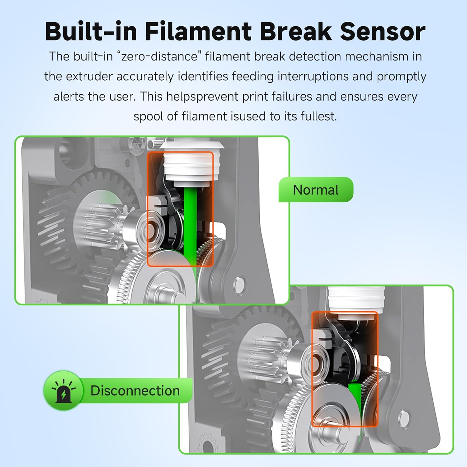 - 【Zero-Gap Filament Sensor】:Say goodbye to surprise print fails. Our built-in filament break sensor detects feed issues instantly and alerts you before things go south.