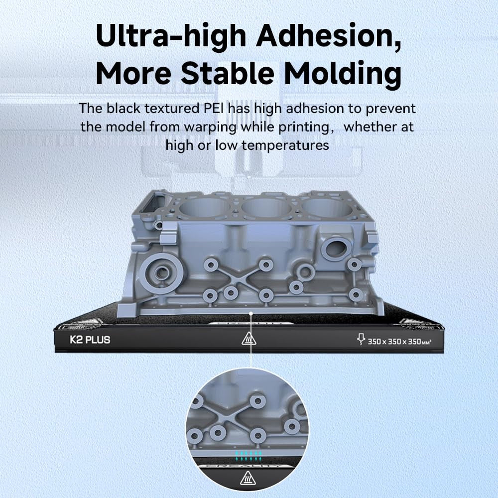 * 【Quality Assurance】With heat and wear-resistant, frosted PEI powder coating, Creality K2 Plus build plate surface is not easy to get scratched or damaged. Size: 370x370mm