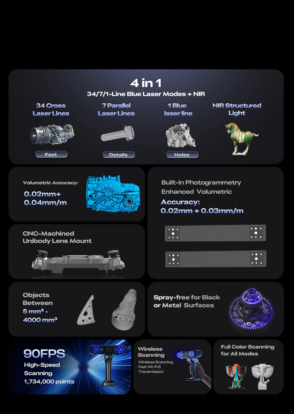 - Four in one multifunctional scanning - combining 34 cross lines (fast), 7 parallel lines (detailed), 1 single line (deep hole) blue laser and NIR structured light (unmarked), suitable for any project.