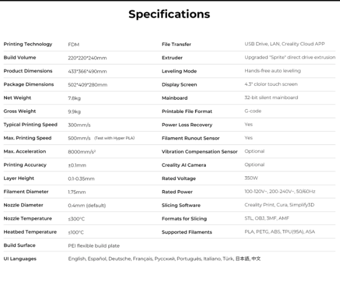 - Reliability & Versatile Printing: High configuration Sprite Direct Extruder, 60W ceramic heater, Bi-metal heatbreak, and copper nozzle enable 300℃ printing and smooth feeding of various filaments. Supports PLA, PETG, ABS, TPU(95A) and ASA filaments
